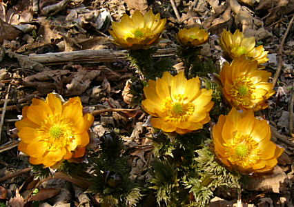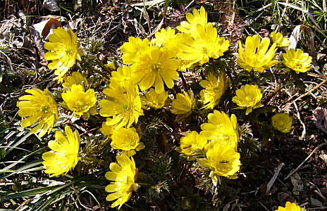 山の広い斜面一帯に福寿草が自生しています。数は多いのですが、ちょっとまばら・・・