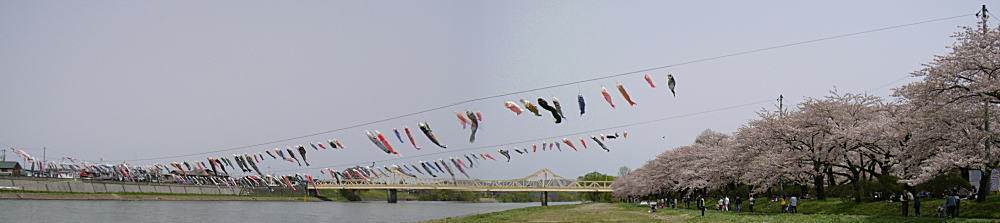 桜並木と北上川の対岸に鯉のぼりが渡してありました。
