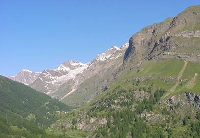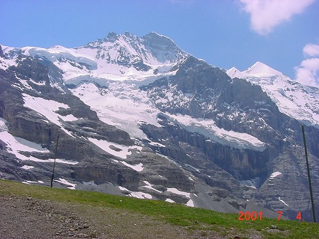 トレッキングの途中で振りかえる。 左端:アイガー 右:メンヒ (4099m) |