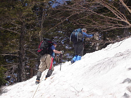 スタートから既に3時間を過ぎたが、急な雪道ではアイゼンと二本ストックの威力が発揮され、