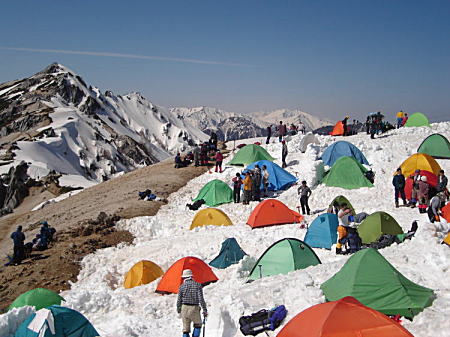 燕山荘の前は色とりどりのテントの華が