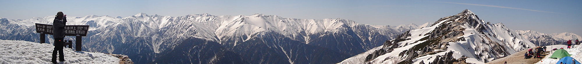燕岳の右手は餓鬼岳、その上には白馬岳、鹿島槍ケ岳が見える。更に右は妙高、火打、黒姫山等の新潟の山々が見渡せる。