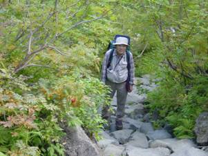 前穂高から岳沢への下りは、ハシゴ、鎖の連続で青木さんは足に豆を作って悪戦苦闘。
