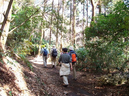 山頂からの下りは湿った露岩の急な下りで滑りやすく、 木立の枝を頼りに慎重に降りた。 標高差訳50mを降りきると、標高差20m前後のピークを 幾つか登り降りしての標高100m位の尾根歩きが続く。 覚園寺への分岐を過ぎると、次は建長寺への分岐に 出た。 真っ直ぐの登山道は六国見山(147m)を経由して 円覚寺を回りこみ、北鎌倉までの尾根下りであり、 我々は建長寺へのルートを取る。 |