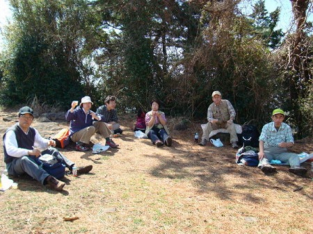 計画スケジュール通りの11:05ピッタシに到着した。 今日はハイカーも少なく、広場でお弁当を広げている のは2、3Gpしかいない。 我々もここで車座に座り込み昼食とし、先ずは恒例の 梅酒で乾杯から入る。 一汗かいた後、青天井の下で食べるオニギリや ラーメンが旨い。 30分ほどノンビリ休憩して予定より早めに下りに入る (12:35)。 |