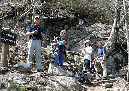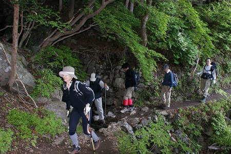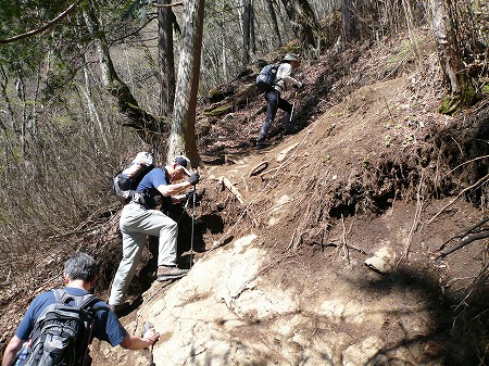 両神神社まで来た道を戻るのだが、先行した 堀さん、竹内さんが急に姿を消した。 いやに逃げ足が速いと後続の小野寺さんと 熊本で話していると、上方で「熊本さーーん」 と呼ぶ声がする。 どうやら途中で別コースに入ったらしい。 |