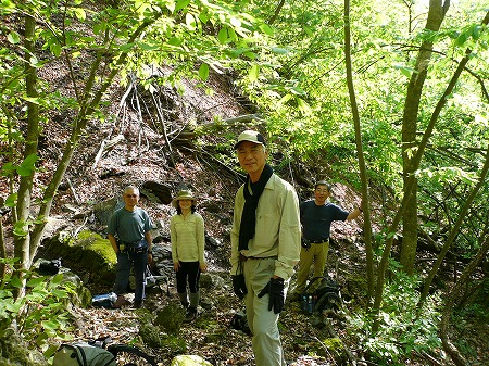 沢を数回渡り返しながら急斜面をヒタスラ下る。 時々休んで新緑のさわやかな酸素とマイナス イオンで元気を補給する。 |