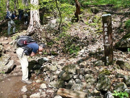 更に延々と続く二輪草のお花畑を約30分登ると 「弘法之井戸」の標識に出た。 |