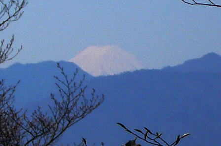 残すところ山頂まで30分で標高差約120mを 詰めれば良い。 一旦20mほど下り、10分ほどで緩い登りに なると、木の間から富士山から頭を現している。 |