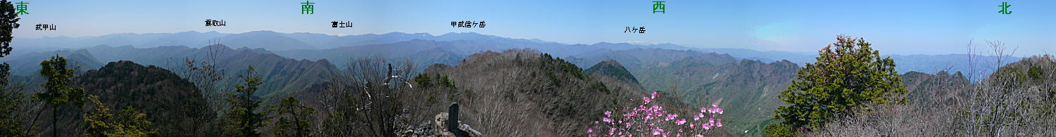 見渡せば360度の展望で南アルプス、八ヶ岳、 富士、秩父山塊の雲取山や金峰山が見える。 参考リンク: CGパノラマ100名山 両神山 |