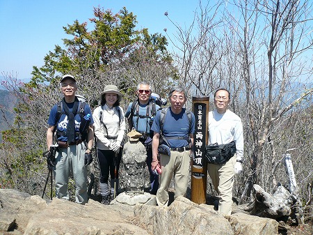 青空にピンク色のヤシオツツジが鮮やかに映え、 更にその先には、稜線を真っ白に冠した残雪の 八ケ岳が控え、この素晴らしい景観は、 多くの山頂に立ったが初めてであり、全員感激する。 |