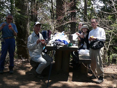 結局、小野寺さん、熊本が先に両神神社に 着き、暫くして堀さん、竹内さん、雄さんが 追いついた(11:20)。 二つあるベンチの一つを我々で占め、昼食 とした。 梅酒で山頂を極めた乾杯をして、コンビニで 調達した食事にありつく。 |