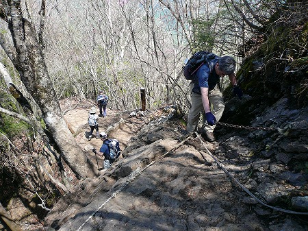 10分ほど登ると最初の垂直10m鎖場に 出くわした。 岩場は適度の手掛り足掛りがあり、鎖に 頼らず三点支持で難なく登りこなす。 更に20m、10mの鎖場が次々と3度、現れ これも難なく登攀できた。 |