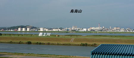 次に最上川の雄大な河口を堤防の上から見る。 鳥海山も夏霞のかなたで雄大。 写真ではわからないが、残雪もある。 |
