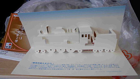 昼飯は事前に熊本さんから美味しい駅弁の案内 があり、全員思い思いの弁当を買っていた。 特に良いと思ったのは吉松さんの買った SL浪漫弁当。 私が買ったSL弁当より百円高いが、中身が いいのとおまけのSLの紙の模型がかわいい。 百円をケチってはいけないと反省。 |