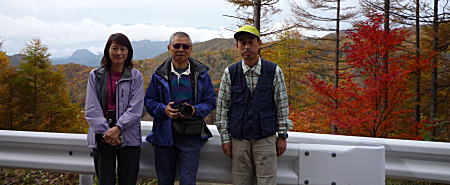 標高1000mを越えると周りの山々が紅葉・黄葉で一面に色づいて広がり、処どころ真っ赤なカエデも出始める。