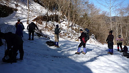 アイゼンを装着し終わったところで、 記念写真を撮り、いよいよ登山開始と なる。 広い砂利の林道であるが、前面カチカチ、 ツルツルに凍結しておりアイゼンなしでは 滑って歩けない。 |