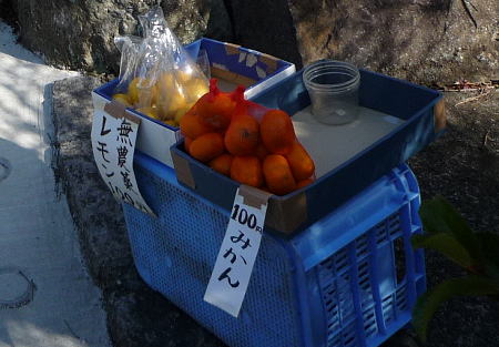早咲きの桜の花や水仙などを 見ながら歩き始めると、道端の 所々に朝取れのミカン(12個)、 レモン(3)が¥100、他に、干し柿、 等を篭に入れて置いてある。 早速、雄さん、熊本がミカン、根岸さん が干し柿、川島さんがブロッコリと レモンを買い入れる。 登り始めから少々荷物が重くなった が後が楽しみである。 |