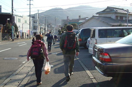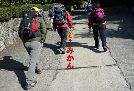 スタートから1時間ほど歩いたところ で、2回目の休憩に入り、今度は 熊本が買ったミカンを出し、荷を軽く する。 |