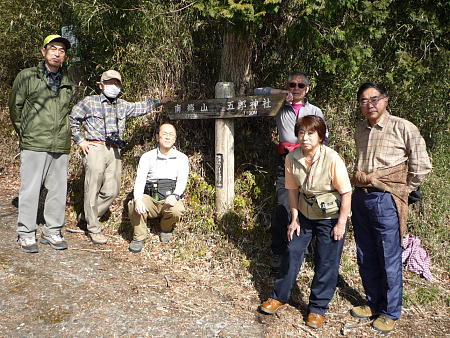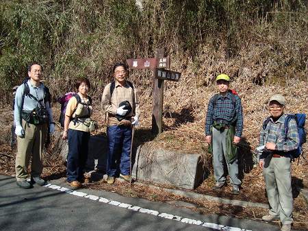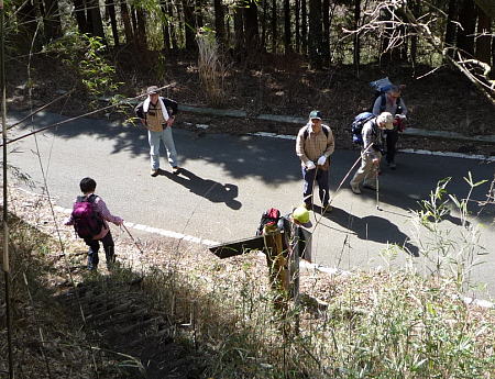 20分程あるいて、山道に入るところ で、着替えタイム。着込んできた 上着を一枚、二枚と剥ぎ軽装になる。 川島さんはTシャツ一枚である。 このタイミングで雄さんが今買った ミカンを全員に配り水分補給。 雄さんに先を越され荷物を軽くする のに出遅れた。 しかしこの青島ミカンは甘く瑞々しく て旨い。 ここで最初の集合写真を一枚撮る。 |