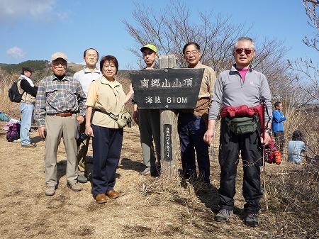 そこが南郷山(611m)の山頂で あった(10:45)。 予定より15分早く到着した。 360度の展望で太平洋側の景色と 箱根山塊の山並み、そして目の 前に、これから行く幕山が見える。 山頂の標識を囲んで記念写真を撮り、 幕山に向かう。 |