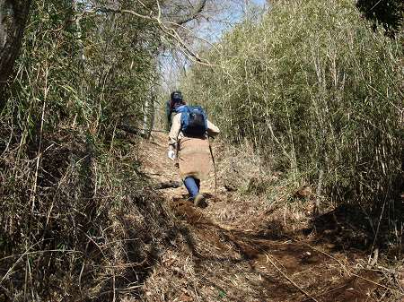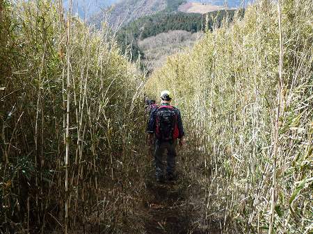 一面ハコネダケがビッシリと茂った 登山道を暫く行くと、ヤット一人が 歩ける程の細い急な下りになる。 登山道は湿っており滑りやすい。 茂ったハコネダケを両手で掴み ながらユックリ下る。 逆コースで登ってくる登山客に道 を開けるのが一苦労で、何回か 茂みに身を寄せて止まる。 |