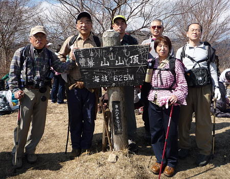 20分程緩やかな斜面を登ると 広いカヤトの幕山の山頂(625m) に出た(11:40)。 しかし広い山頂も登山客の昼食で 埋め尽くされており、我々が座る スペースが殆どなく、山頂の 記念写真を撮って下山することにする。 |