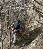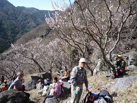 結局、梅林の上部のロッククライミング ![]() の練習場がある岩壁の近くまできて ヤットスペースを見つけ昼食となった。 眼下に梅林を眺めながら、川島さんが 持ってきてくれた漬物をツマミに、 梅酒、焼酎のお湯割りで梅見の宴と なり、これまた楽しい昼食会となった。 |