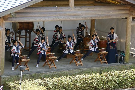 下では「梅日和」と題して小田原市に ある相洋高校和太鼓部による和太鼓 演奏が演奏されていた。 和太鼓は女性に人気があるらしく、 部員の過半数は女性であった。 |