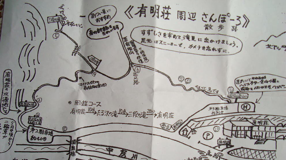 三段の滝から一旦標識まで下り、 更に右に巻くように下りると下方に 有明荘の屋根が見えてくる。 |