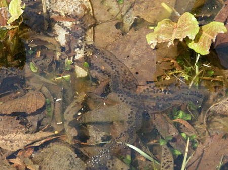 雪解けの山から流れた小さな水溜りにカエルの 卵が1m程の長さの透明な袋に一杯入っていて、 恐らくあと10日もすれば、オタマジャクシに なっていることだろう。 |