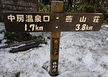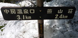 常に有明山(2268m)を対面に見 ながらジグザグの折り返しで高度を 稼いでいくが、思った程の急登では なく、35分で第一ベンチ(1600m)に 着いた(8:45)。 此処までは積雪は殆どなかった。 しかし、昨日下山して同宿した人が、 「第一ベンチ以上は残雪が始まり、 固く凍って滑りやすく、第一ベンチ でアイゼンを着けた方が安全である」 と言っていた。 |
