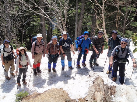 7:45全員集合し、有明荘入口で 集合写真を撮り、残雪の燕岳アタック に向けてスタートを切った。 |