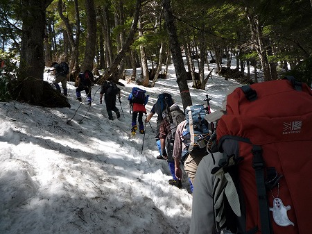 全員アイゼンの装着を終え、Tシャツ 一枚となって第二ベンチに向かう (9:00)。 第一ベンチから第二ベンチとの間は、 まだ雪のない登山道が多く、木の根や 小石でアイゼンが水平に接地せず 極めて歩きにくいが、日陰では残雪が 凍っており、アイゼンの歯が凍結を突き 破って安心して歩け心地良い。 |