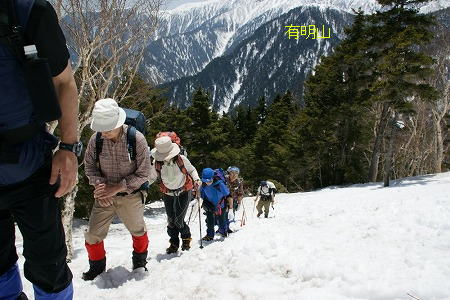 有明山頂が殆ど目の高さと同じ になり、更に燕岳から大天井、 常念に繋がる尾根の稜線 (表銀座縦走コース)が近づき、 雪庇がハッキリと確認できるよう になってきた。 |