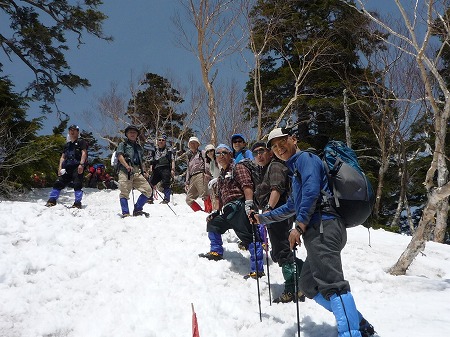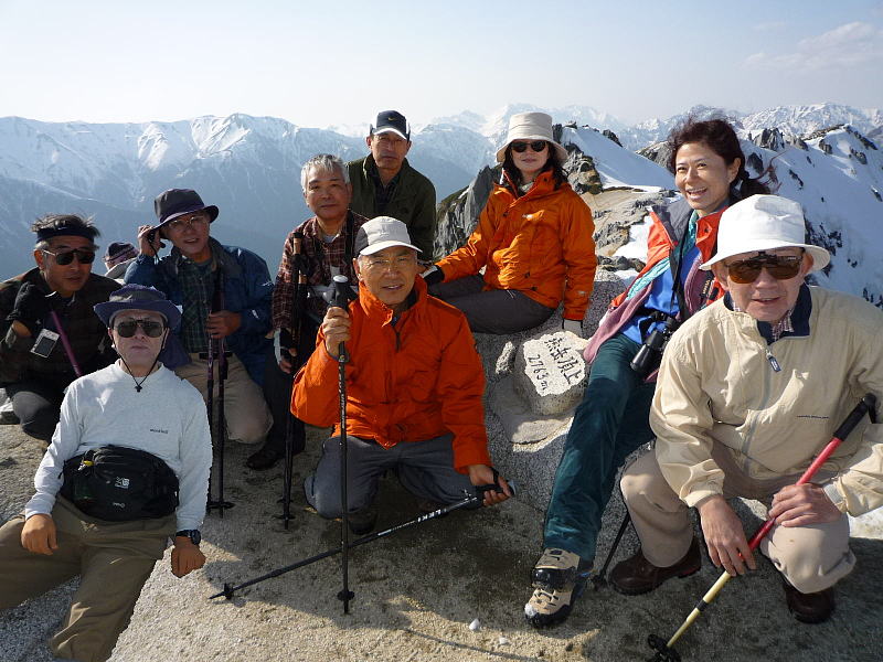 頂上直下の最後の急登。 燕山荘で昼食をとらずにきたため、 エネルギー不足でシャリバテ気味。 疲れと、雪で滑らないようゆっくり来た ため、燕山荘から標準で30分のコース のところ、50分かかってしまった。 が、ついに頂上を極めた。 16:00 山頂は狭く、皆で寄り添って証拠 写真を撮る。 |