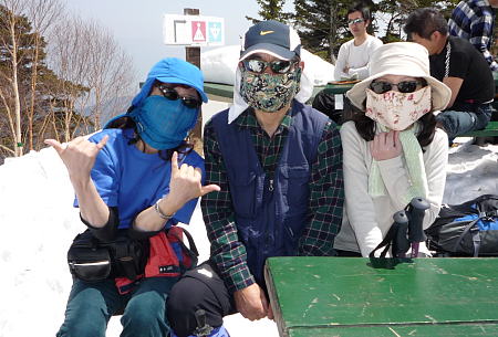 ここから本格的な合戦尾根の急登 となるため十分に休息をとる。 快晴の直射日光で雪の照り返しが 強烈。日焼け止めクリームを塗り 重ねる。田形さん、文さん、小野寺さん はさらに、どハデなマスクで顔を 保護。怪しい3人組が誕生。 |