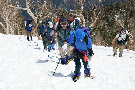 一段と傾斜がきつくなり、積雪も 1m近くなって来ている。 小野寺さんが、頭が痛いとの報告 があった。既に標高2000mを越えて おり、軽い高山病の症状が現れたと 思われ、水と、特効薬の「救心」を 二粒飲んでもらい、少し休息を入れ たところ、効果が現れ、短時間で 頭の痛みが取れて良かった。 |