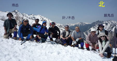 直登を何とか凌ぎ詰めて合戦沢 の頭に立つ(2489m、13:20)。 既に森林限界を超え、 潅木は雪の下に埋まり、雪原が広がり 景観が一新する。 正面遠く尾根上に燕山荘の小屋が見え、 その右手には燕岳山頂、更に右手に 針の木岳(山姿から剣岳と間違えた)、 餓鬼岳が見え、左手方向には槍ヶ岳が 全貌を現している。 |