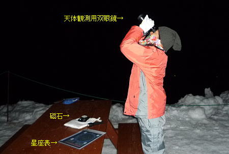 しかし、田形さんは星の観察に出た。 観察グッズは完璧。 ![]() 月のクレーターはよく見えたが、月明かり で肝心の☆はいまひとつ。 翌早朝、日の出前に再チャレンジして みることにした。 |