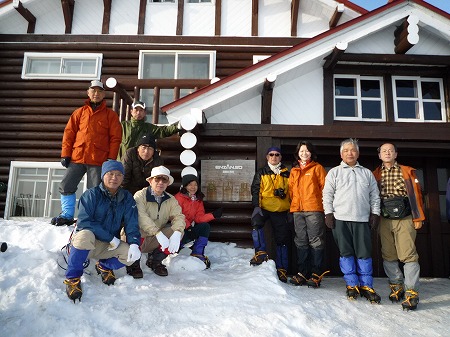 昨日は暖かさで雪面がシャーベット 状に融けていたが、寒さで固く締り、 アイゼンの歯がザク、ザクと食い込み 歩き易い。 |