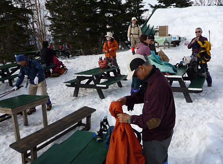 第三ベンチで二回目の休憩を取る。 この辺りでは昨日の暑さで雪も大分 溶けたようで、土が出始めている。 |
