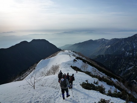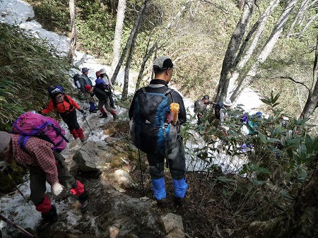 合戦沢までの急下りはアイゼンを シッカリ踵から踏み込み、ストックで バランスを取りながら慎重に下りる。 スリップや転倒したら谷底まで一直線 に落ちてしまう。 |