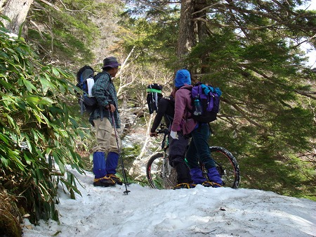 第三ベンチに向かう途中で何と マウンテンバイクで山頂に登る人に 出会った。 殆ど転がしているか、担いで登るようで、 我々一同唖然!恐れ入りました。 |