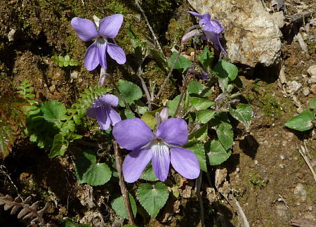 第一ベンチも過ぎると、雪はなく、春の 世界。下方に中房温泉の屋根が見え はじめると道端にスミレが咲いていた。 今回のルートで唯一の花である。 |