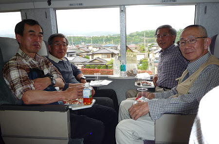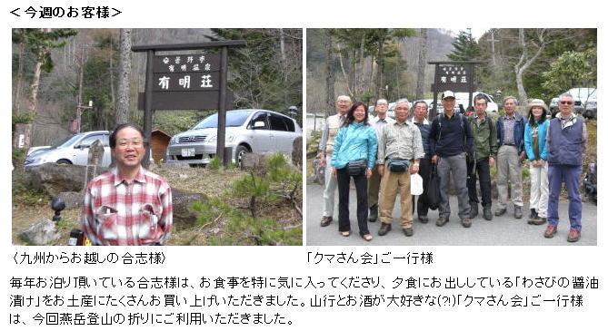 | お腹いっぱいになり、良い気持ちでバスを待っていると、有明荘のスタッフがカメラを持って近づいてきて、 全員の写真を撮らせて欲しいとのこと、有明荘ホームページに載せたいとことで、勿論OK。 すると、さっそく、5月5日の新着情報として掲載された。 ↓掲載内容ここから ![]() ↑掲載内容ここまで 少々のアルコールで気持ちよくバスの人となり爆睡して穂高駅に向かいました。 穂高駅には一時間に一本しかない電車に余裕2分ギリギリで間に合い何とか13:44の松本行 に間に合った。松本駅では途中下車して土産物を買う時間を予定していたが、14:48の始発 「スーパーあずさ22号」に乗ろうと意見一致し、 |