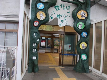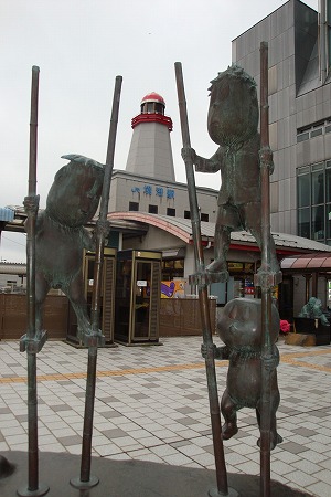 ロードの西の端はJR境線終着の境港駅。 米子と境港間を走るJR境線はとっくに 妖怪たちに占領されていて、境港駅は 「鬼太郎駅」、米子駅は「ねずみ男駅」と 改名され、それ以外の駅も全部無人の 妖怪駅。 「鬼太郎列車」「ねずみ男列車」 「ねこ娘列車」「目玉おやじ列車」が 走っているそうな。 |