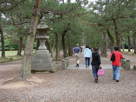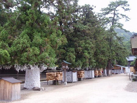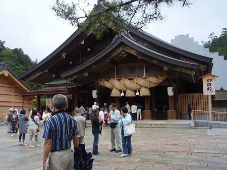 さて、いよいよ境港に別れを告げて、 ぼたんの花と薬用人参で名高い大根島を 通り抜け、宍道湖を左手に眺めながら 一路出雲大社へと。 一般道を快適に走って、1時間ほどで 出雲大社に到着しました。 小雨に濡れた松並木の参道の玉砂利を 踏んで、ゆっくりと本殿に向かいました。 |