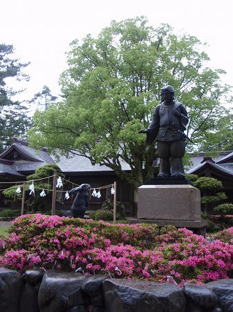 出雲大社は大国主命を祀る神社。 縁結びの神として夙に有名です。 参道には、神話に因んで「大国主命と 因幡の白兎」の像が建っていました。 |