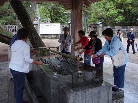 手水舎で手を清め、口もゆすいで。 「まず、左手を清め、それから右手。」 「柄杓に直接口をつけてはいかん」 「いや、そのくらいは良いのではないか」 などと作法談義百出し、折角参道で鎮めた 心がまた千々に乱れたのであります。 |